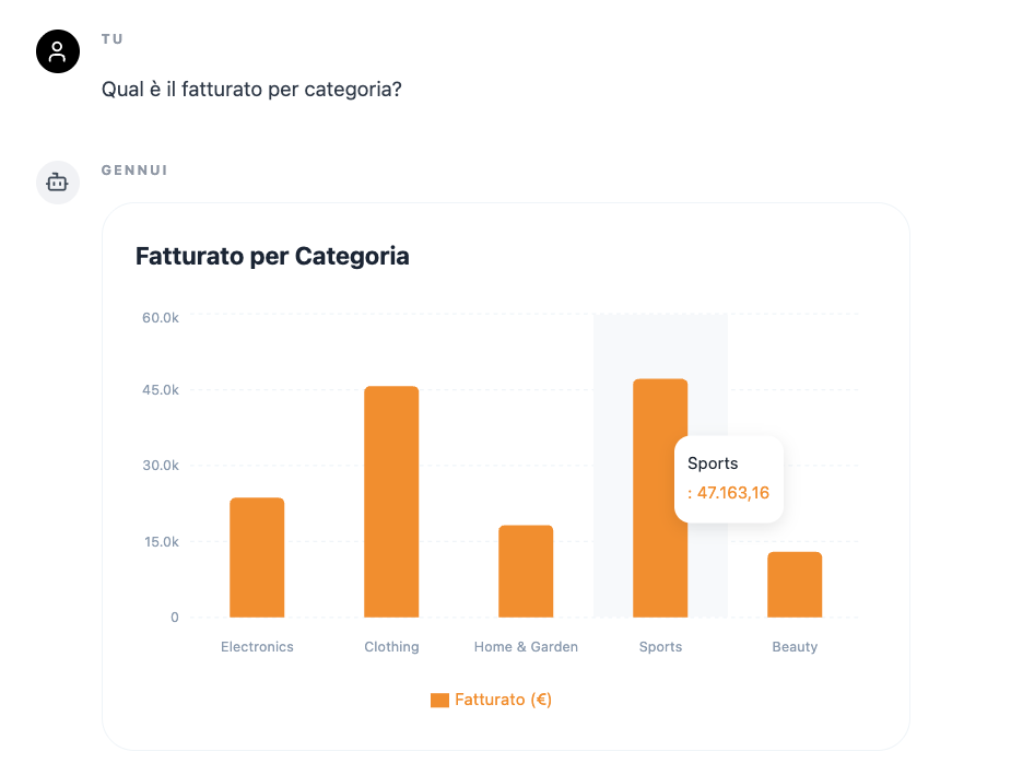 Genn è la mia architettura proprietaria che trasforma il modo in cui interagisci con i dati. Utilizza la Generative UI per mostrare solo ciò che serve quando serve. Se chiedi un bilancio, Genn non ti manda a cercare in un menu, ma genera un grafico interattivo direttamente nella chat.